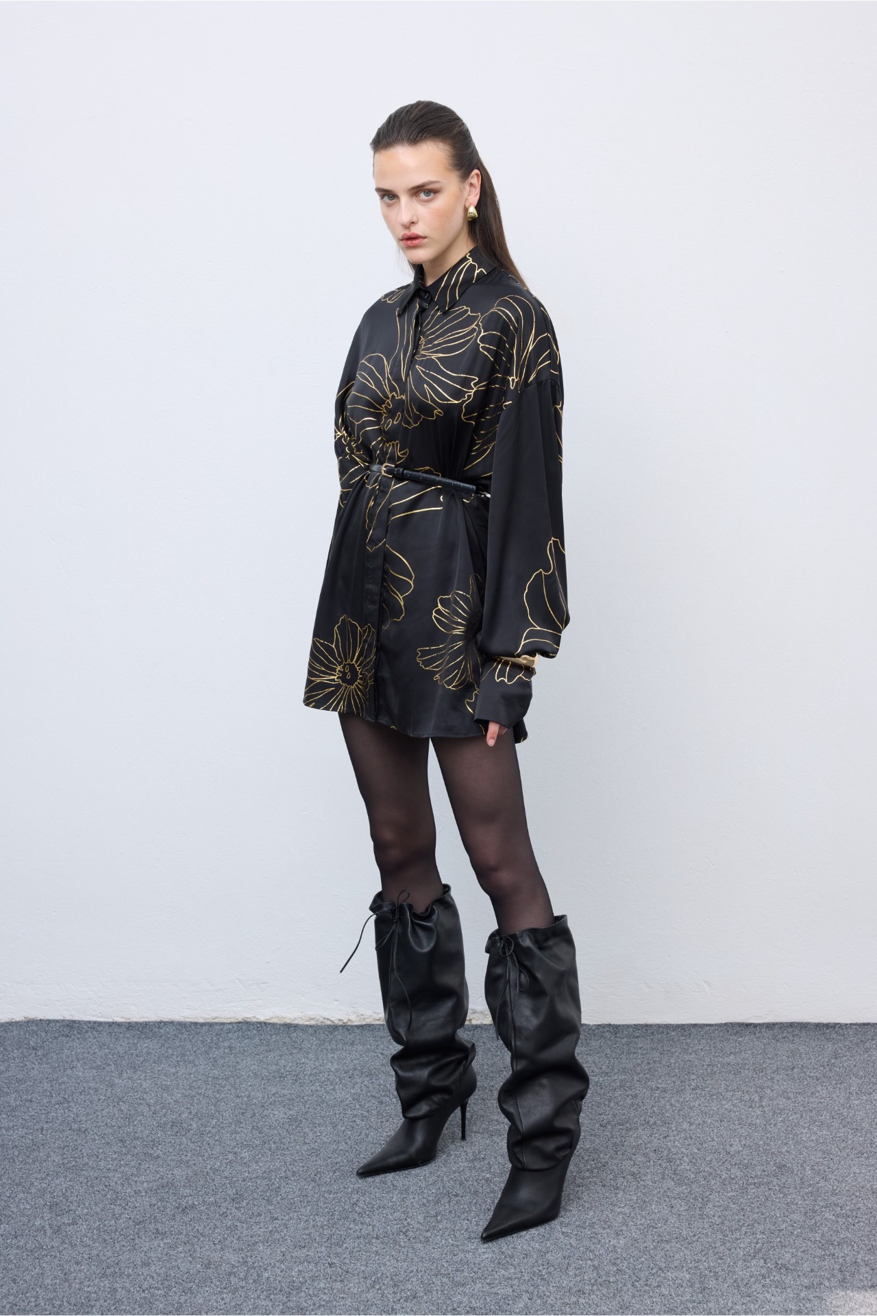 Elevate your wardrobe with this effortlessly chic oversized shirt, featuring a bold floral line print. Crafted from lightweight, silky fabric, it drapes beautifully for a relaxed yet refined silhouette. The soft structure, voluminous sleeves, and minimalist collar add a touch of modern sophistication, while the monochrome palette ensures timeless appeal. Style it belted for definition or wear it loose for a more laid-back look.