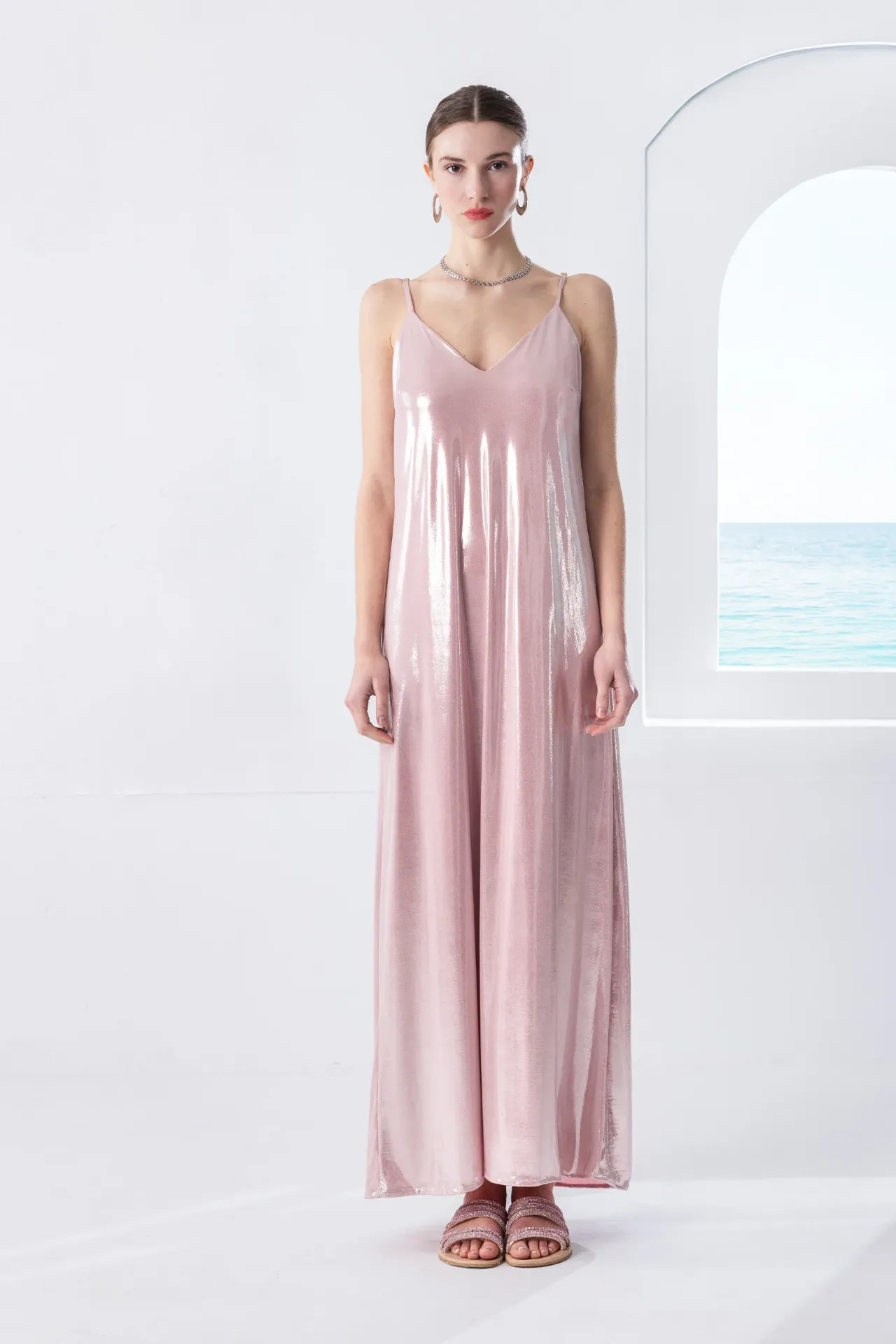 Μακρύ φόρεμα σε μεταλλιζέ ροζ απόχρωση με διακριτική γυαλάδα που αντανακλά το φως σε κάθε βήμα. Διαθέτει λεπτές τιράντες και V λαιμόκοψη, ενώ η άνετη, αέρινη γραμμή του χαρίζει κομψότητα και ελευθερία κίνησης.