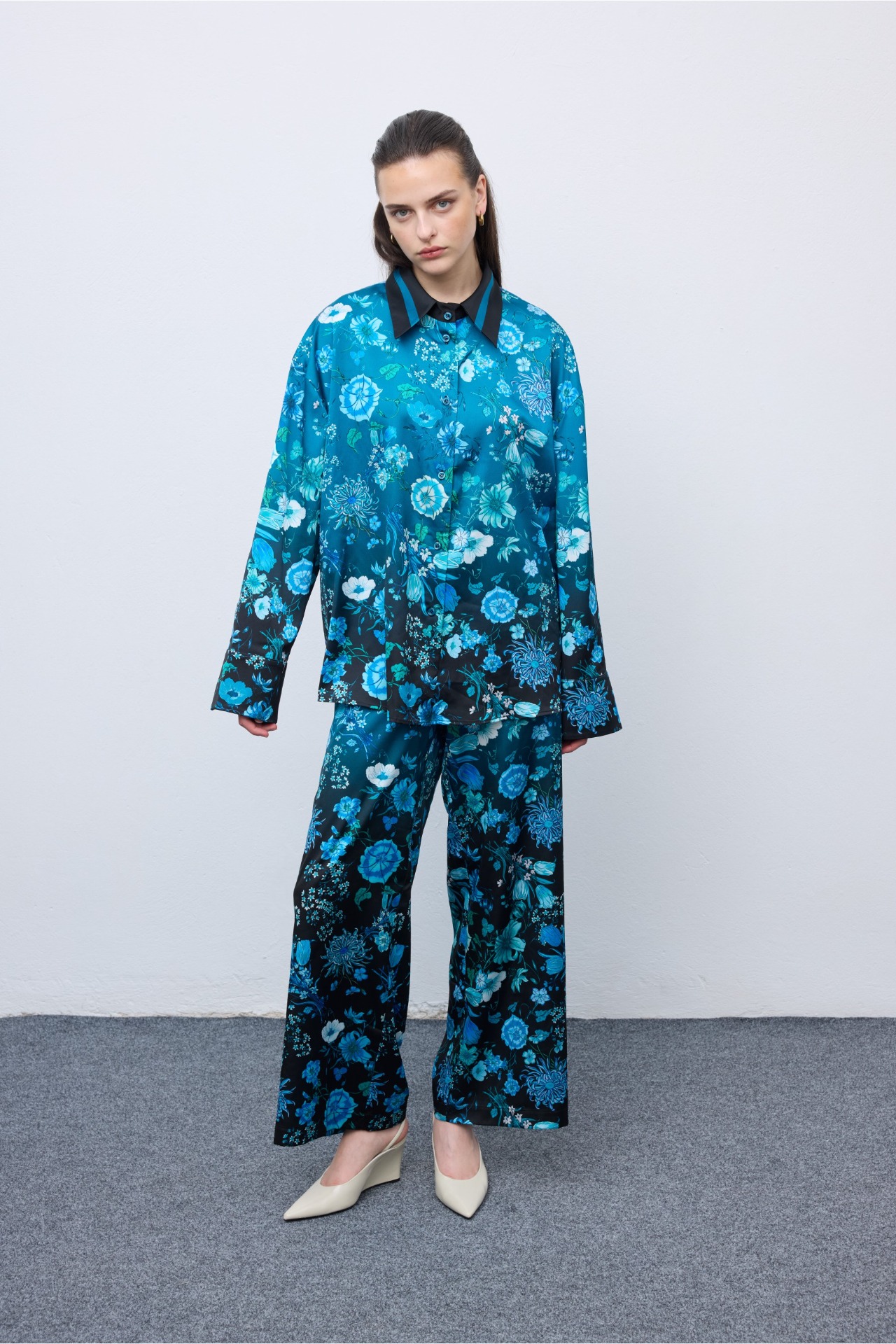 The Skyfall Blossom Pyjama Set blends fluid elegance with bold artistry - a true statement piece for every modern muse. Crafted from a soft, flowing fabric that moves beautifully with the body , this set features a relaxed silhouette, wide-leg trousers and a deep V-neckline for a touch of understated allure. Its print captures the spirit of freedom and modern femininity-perfect for both refined evenings in and elegant outings.
