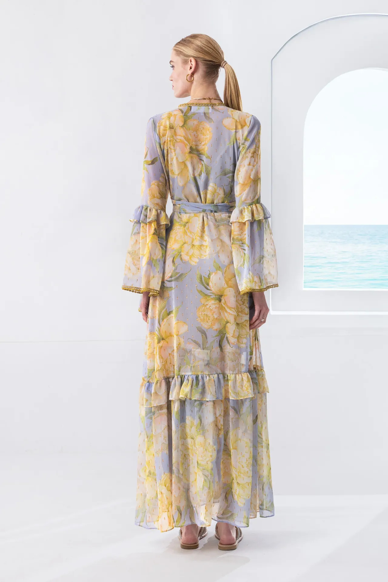 Τα μακριά μανίκια με διπλό βολάν και η φούστα με διακριτικές πιέτες χαρίζουν ρομαντική κίνηση και αέρινη αίσθηση. Ιδανικό για καλοκαιρινές εμφανίσεις, βαπτίσεις, νησιώτικους γάμους και ιδιαίτερες περιστάσεις.